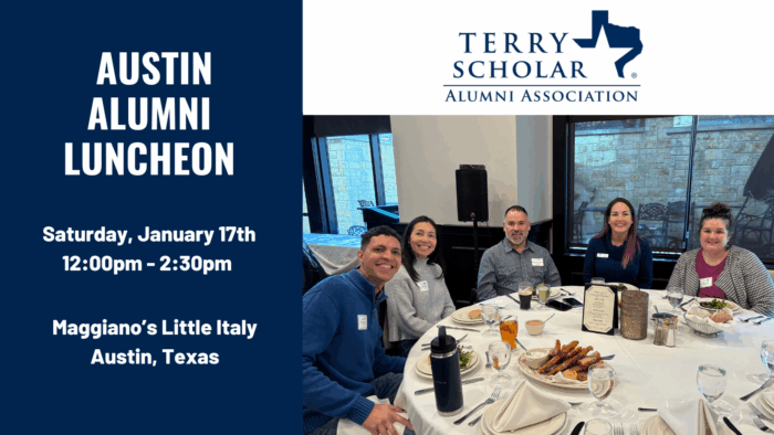 Join fellow Terry Scholar Alumni and members of the Terry Foundation Board and staff for lunch and a brief update from the Austin Terry Scholar Alumni Association Chapter.